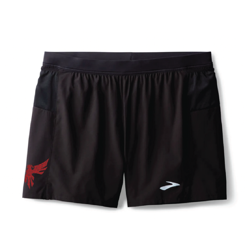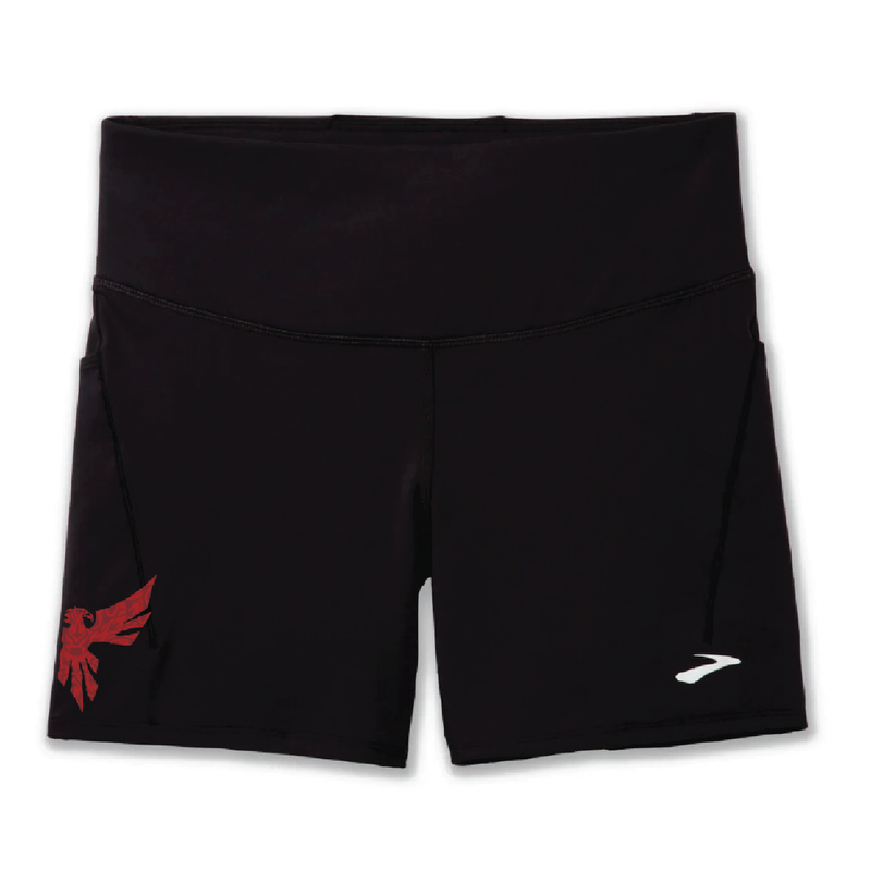 Black Brooks shorts with a red textured Phoenix and white Phoenix Marathon print. Men's Shorts are a lightweight running short. Women's Shorts are a black compression short.
