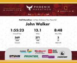 Date: Dec. 13, 2025 Participant: John Walker #7823 Race: 2025 Phoenix Half Marathon Distance: 13.1 miles