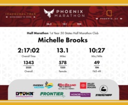 Date: Dec. 13, 2025 Participant: Michelle Brooks #4187 Race: 2025 Phoenix Half Marathon Distance: 13.1 miles