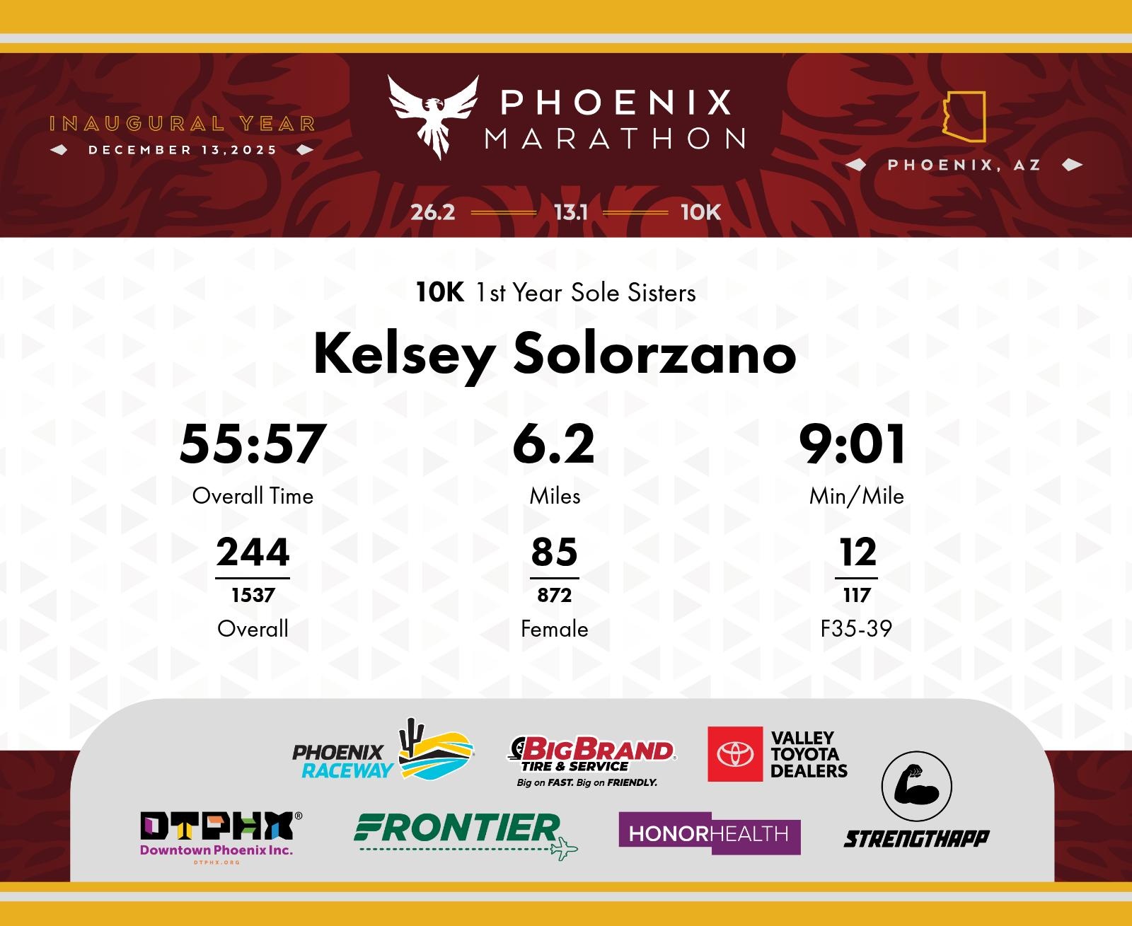 Date: Dec. 13, 2025 Participant: Kelsey Solorzano #6857 Race: 2025 Phoenix 10K Distance: 6.2 miles