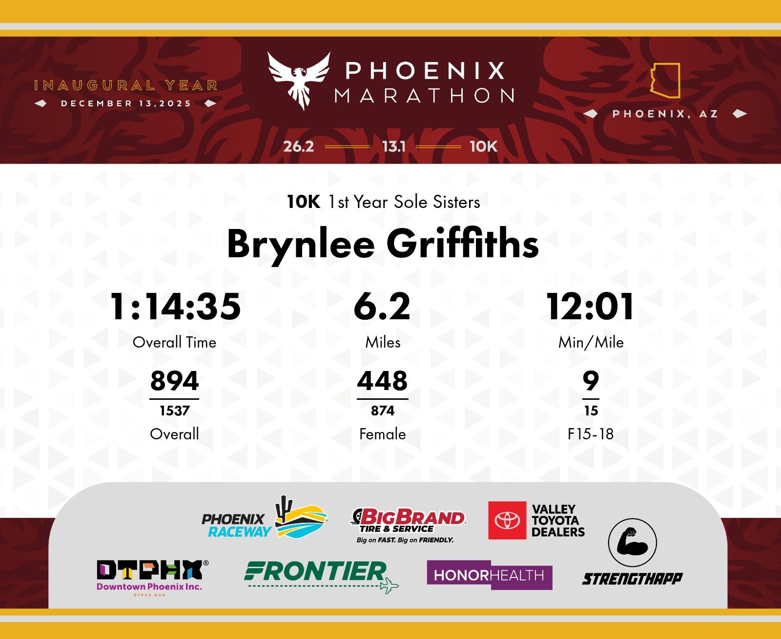 Date: Dec. 13, 2025 Participant: Brynlee Griffiths #6342 Race: 2025 Phoenix 10K Distance: 6.2 miles
