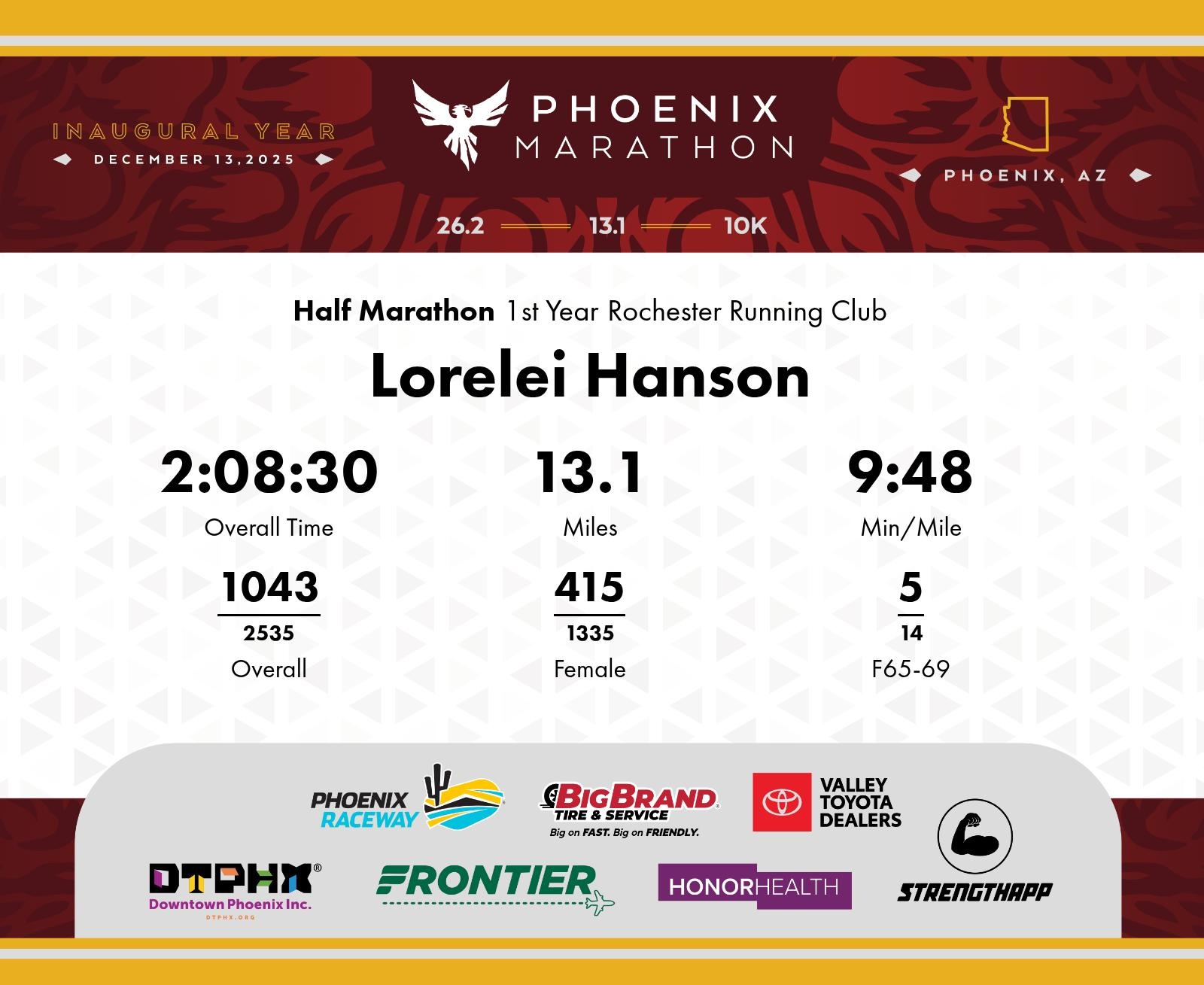 Date: Dec. 13, 2025 Participant: Lorelei Hanson #4595 Race: 2025 Phoenix Half Marathon Distance: 13.1 miles