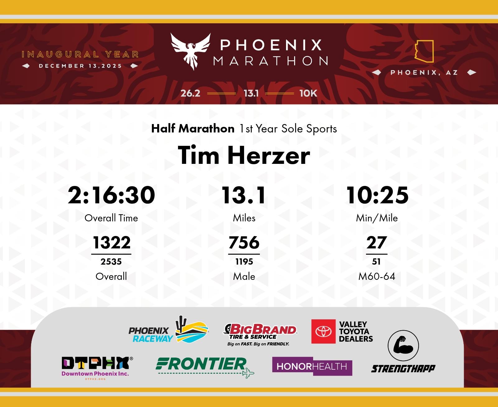 Date: Dec. 13, 2025 Participant: Tim Herzer #7312 Race: 2025 Phoenix Half Marathon Distance: 13.1 miles