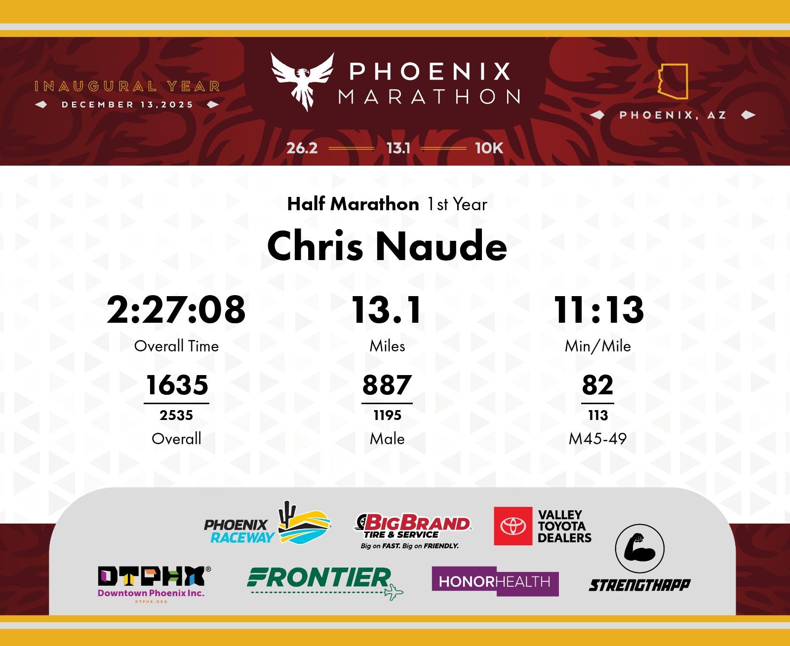 Date: Dec. 13, 2025 Participant: Chris Naude #5053 Race: 2025 Phoenix Half Marathon Distance: 13.1 miles