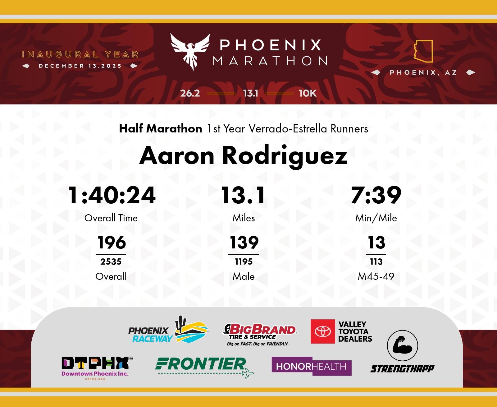 Date: Dec. 13, 2025 Participant: Aaron Rodriguez #5269 Race: 2025 Phoenix Half Marathon Distance: 13.1 miles