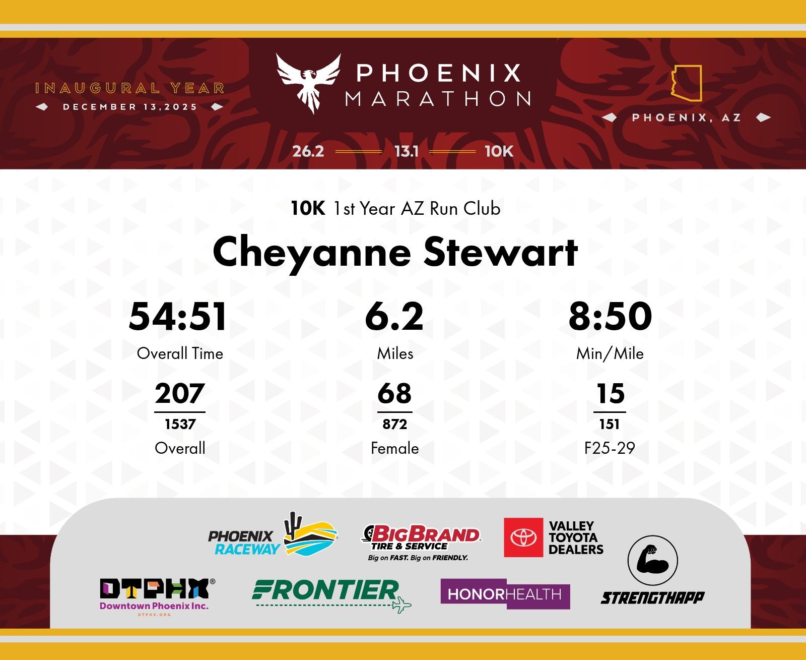 Date: Dec. 13, 2025 Participant: Cheyanne Stewart #8507 Race: 2025 Phoenix 10K Distance: 6.2 miles