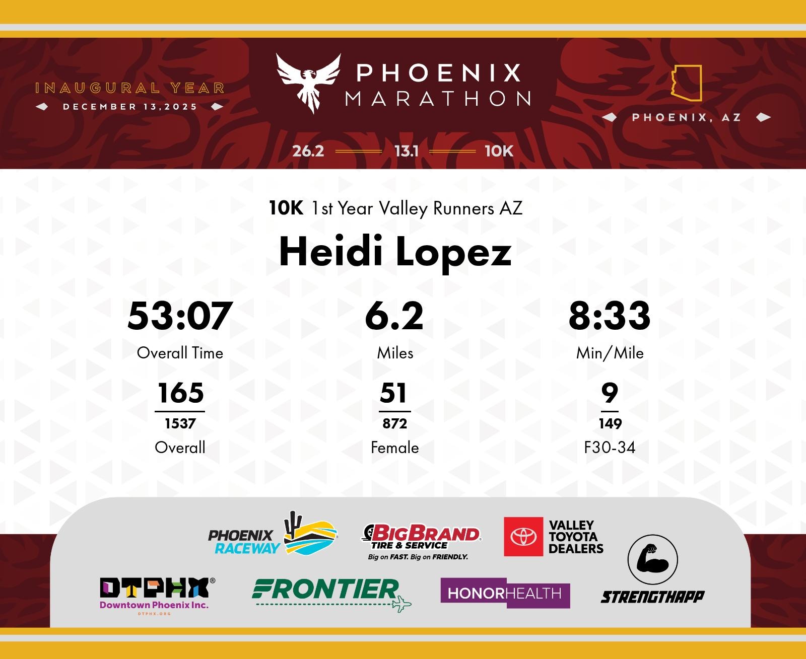 Date: Dec. 13, 2025 Participant: Heidi Lopez #6545 Race: 2025 Phoenix 10K Distance: 6.2 miles