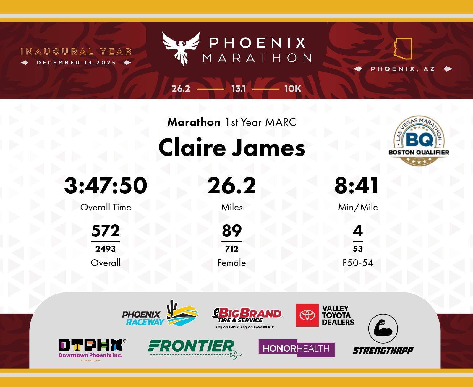 Date: Dec. 13, 2025 Participant: Claire James #2282 Race: 2025 Phoenix Marathon Distance: 26.2 miles