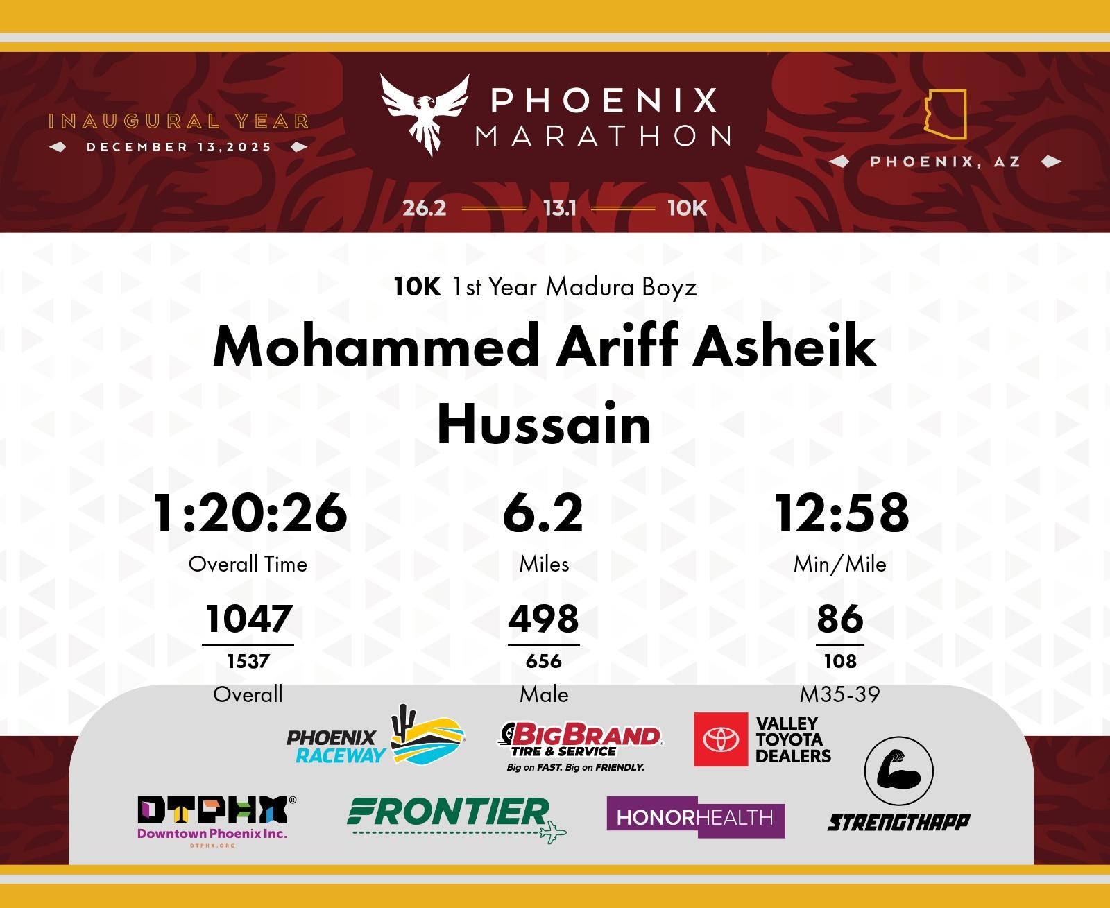 Date: Dec. 13, 2025 Participant: Mohammed Ariff Asheik Hussain #6037 Race: 2025 Phoenix 10K Distance: 6.2 miles