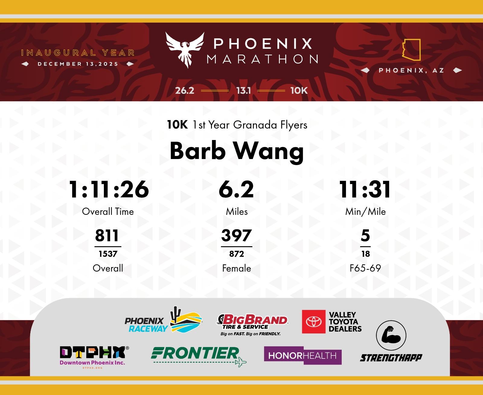 Date: Dec. 13, 2025 Participant: Barb Wang #6969 Race: 2025 Phoenix 10K Distance: 6.2 miles