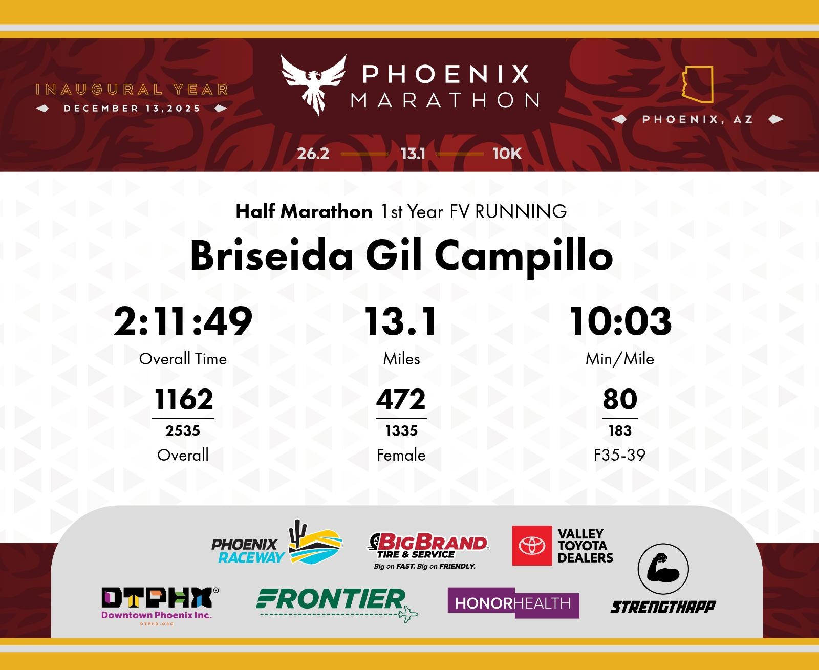 Date: Dec. 13, 2025 Participant: Briseida Gil Campillo #4516 Race: 2025 Phoenix Half Marathon Distance: 13.1 miles