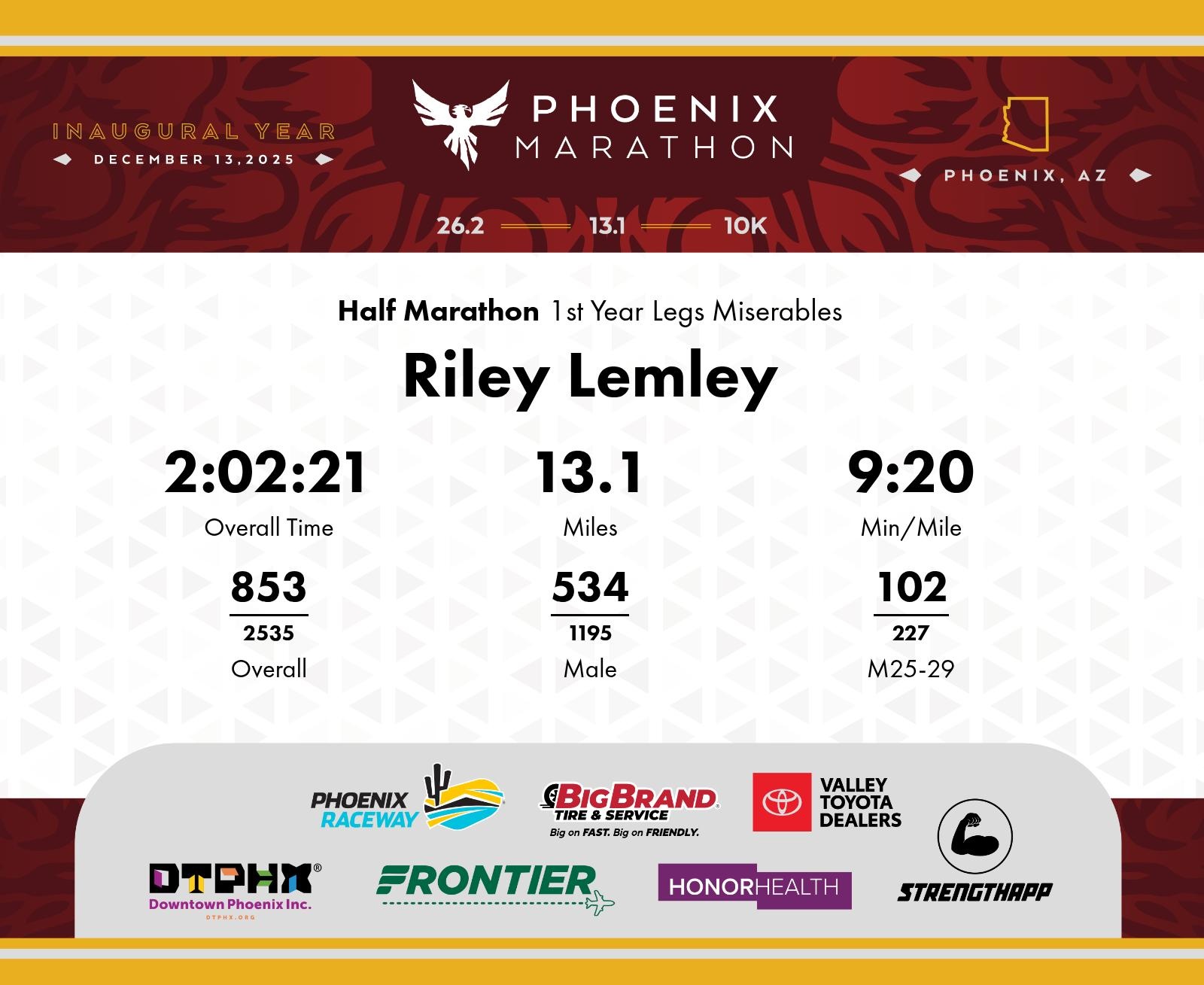 Date: Dec. 13, 2025 Participant: Riley Lemley #4817 Race: 2025 Phoenix Half Marathon Distance: 13.1 miles