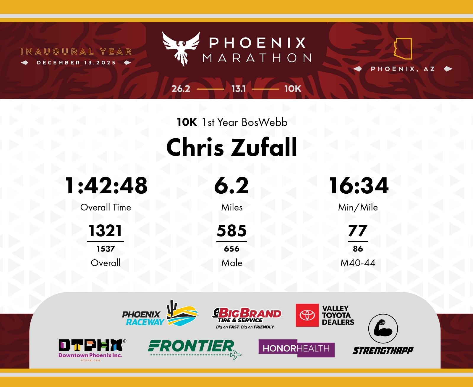Date: Dec. 13, 2025 Participant: Chris Zufall #7013 Race: 2025 Phoenix 10K Distance: 6.2 miles