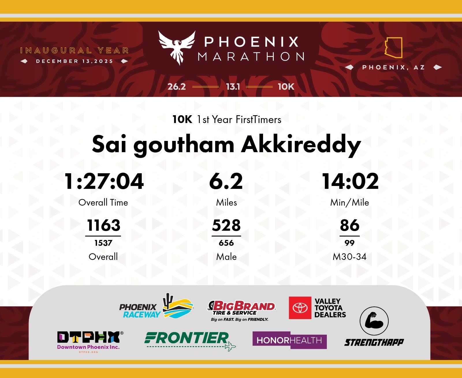 Date: Dec. 13, 2025 Participant: Sai goutham Akkireddy #6008 Race: 2025 Phoenix 10K Distance: 6.2 miles
