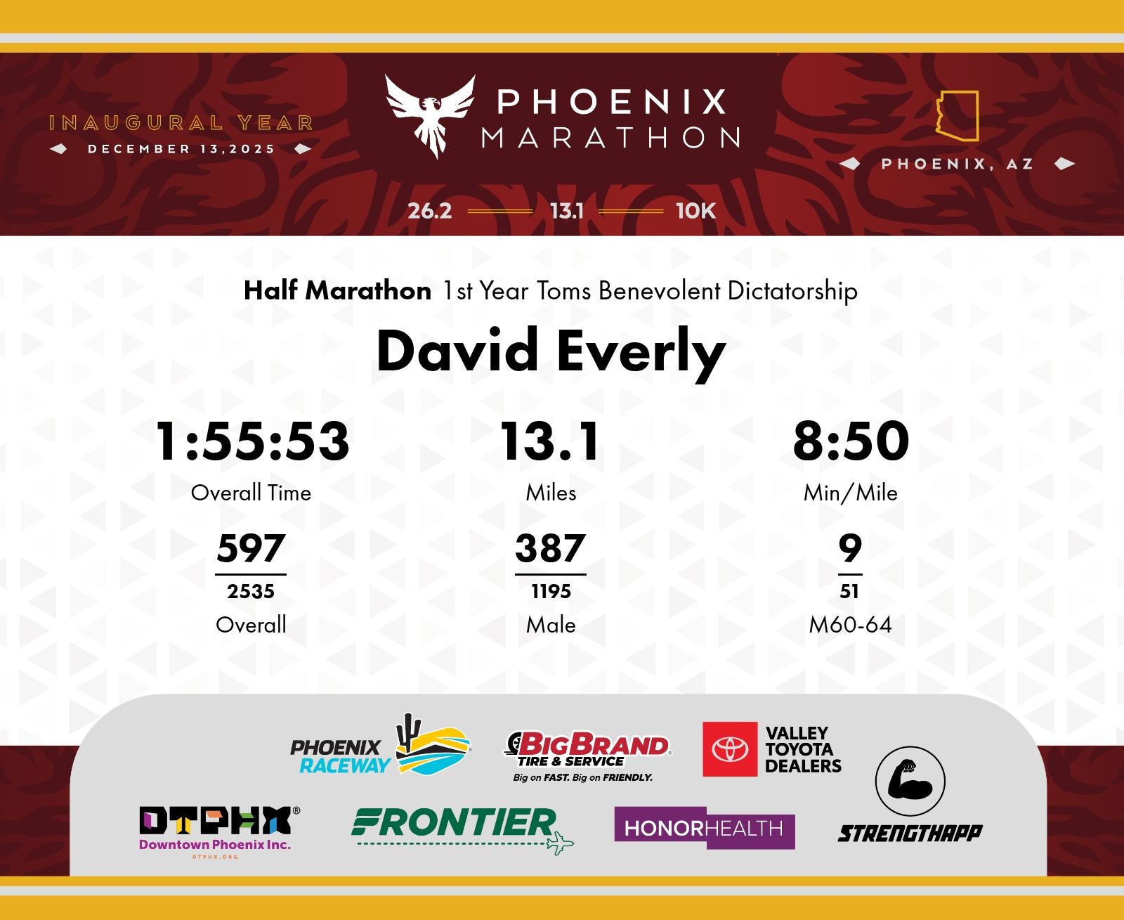 Date: Dec. 13, 2025 Participant: David Everly #4437 Race: 2025 Phoenix Half Marathon Distance: 13.1 miles