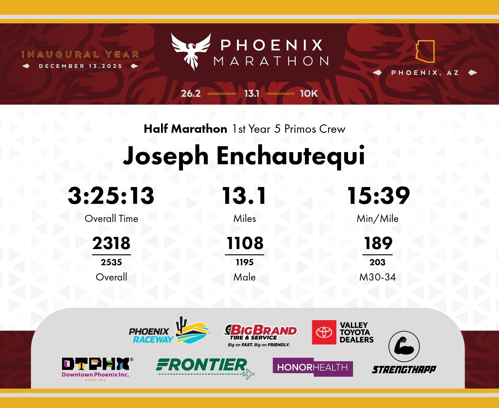 Date: Dec. 13, 2025 Participant: Joseph Enchautequi #4430 Race: 2025 Phoenix Half Marathon Distance: 13.1 miles