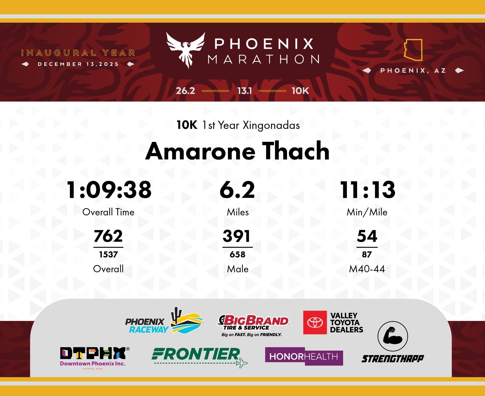Date: Dec. 13, 2025 Participant: Amarone Thach #6908 Race: 2025 Phoenix 10K Distance: 6.2 miles