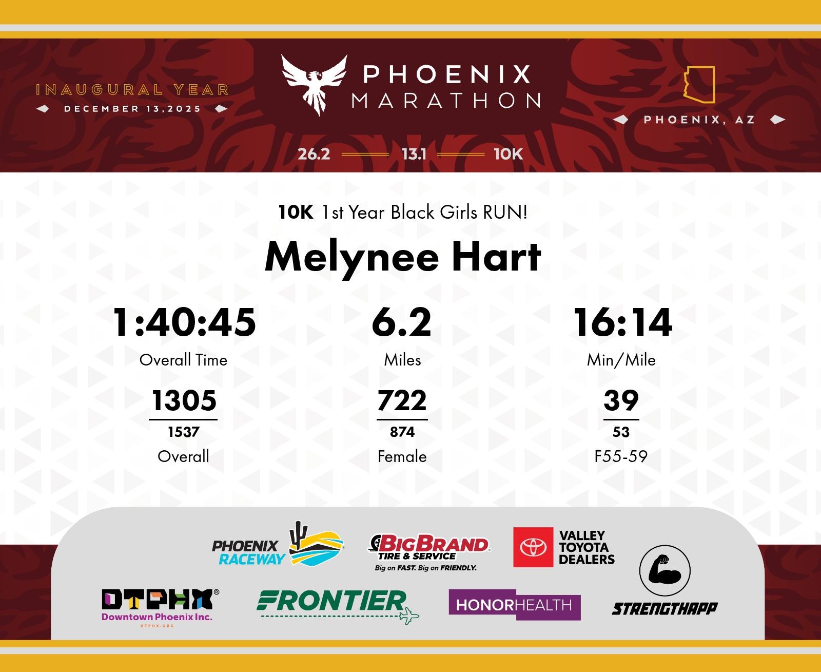 Date: Dec. 13, 2025 Participant: Melynee Hart #6378 Race: 2025 Phoenix 10K Distance: 6.2 miles
