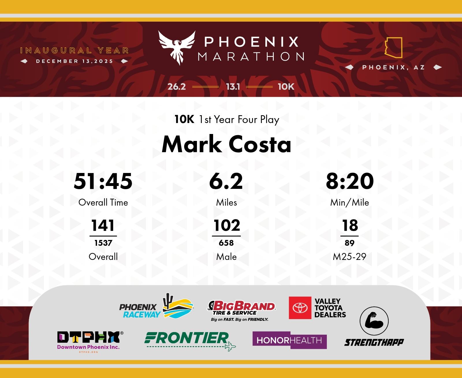 Date: Dec. 13, 2025 Participant: Mark Costa #6183 Race: 2025 Phoenix 10K Distance: 6.2 miles