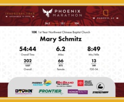 Date: Dec. 13, 2025 Participant: Mary Schmitz #6815 Race: 2025 Phoenix 10K Distance: 6.2 miles
