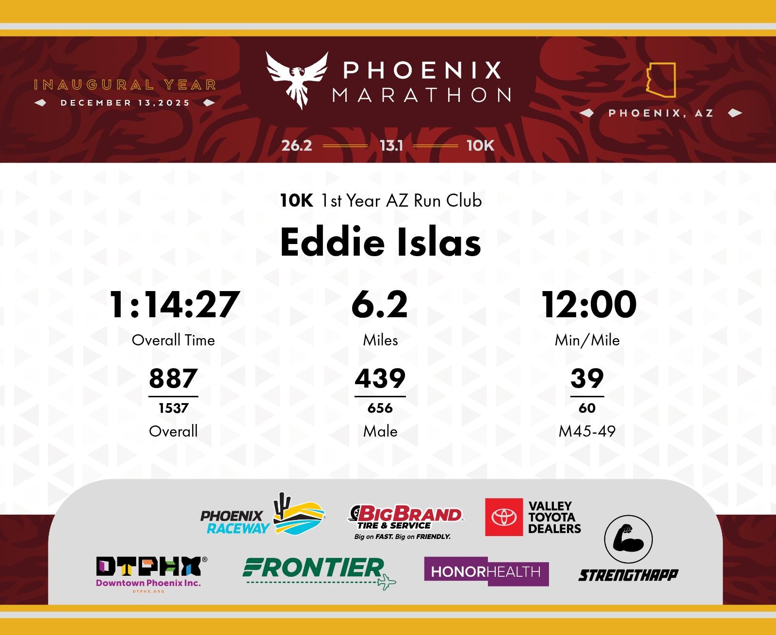 Date: Dec. 13, 2025 Participant: Eddie Islas #6423 Race: 2025 Phoenix 10K Distance: 6.2 miles