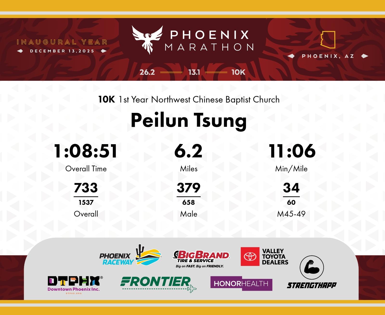 Date: Dec. 13, 2025 Participant: Peilun Tsung #6928 Race: 2025 Phoenix 10K Distance: 6.2 miles