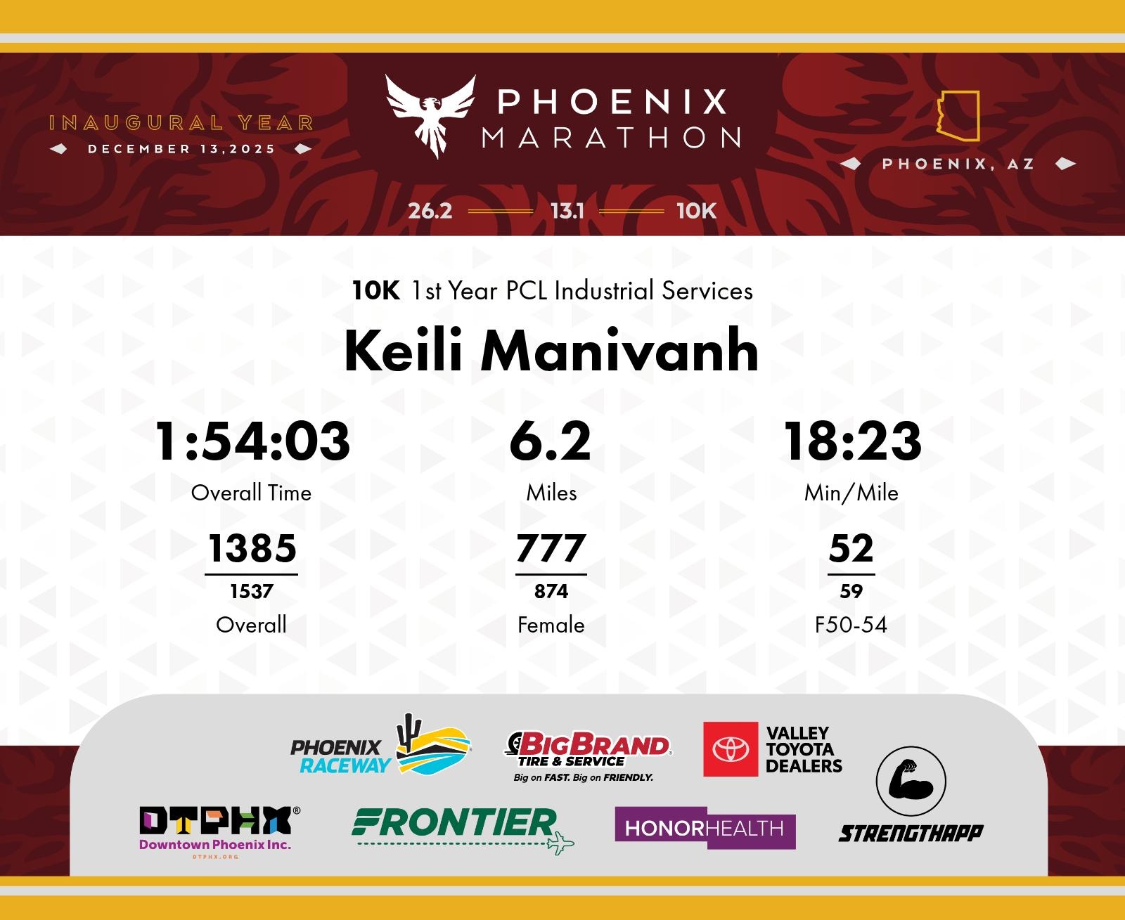 Date: Dec. 13, 2025 Participant: Keili Manivanh #8256 Race: 2025 Phoenix 10K Distance: 6.2 miles