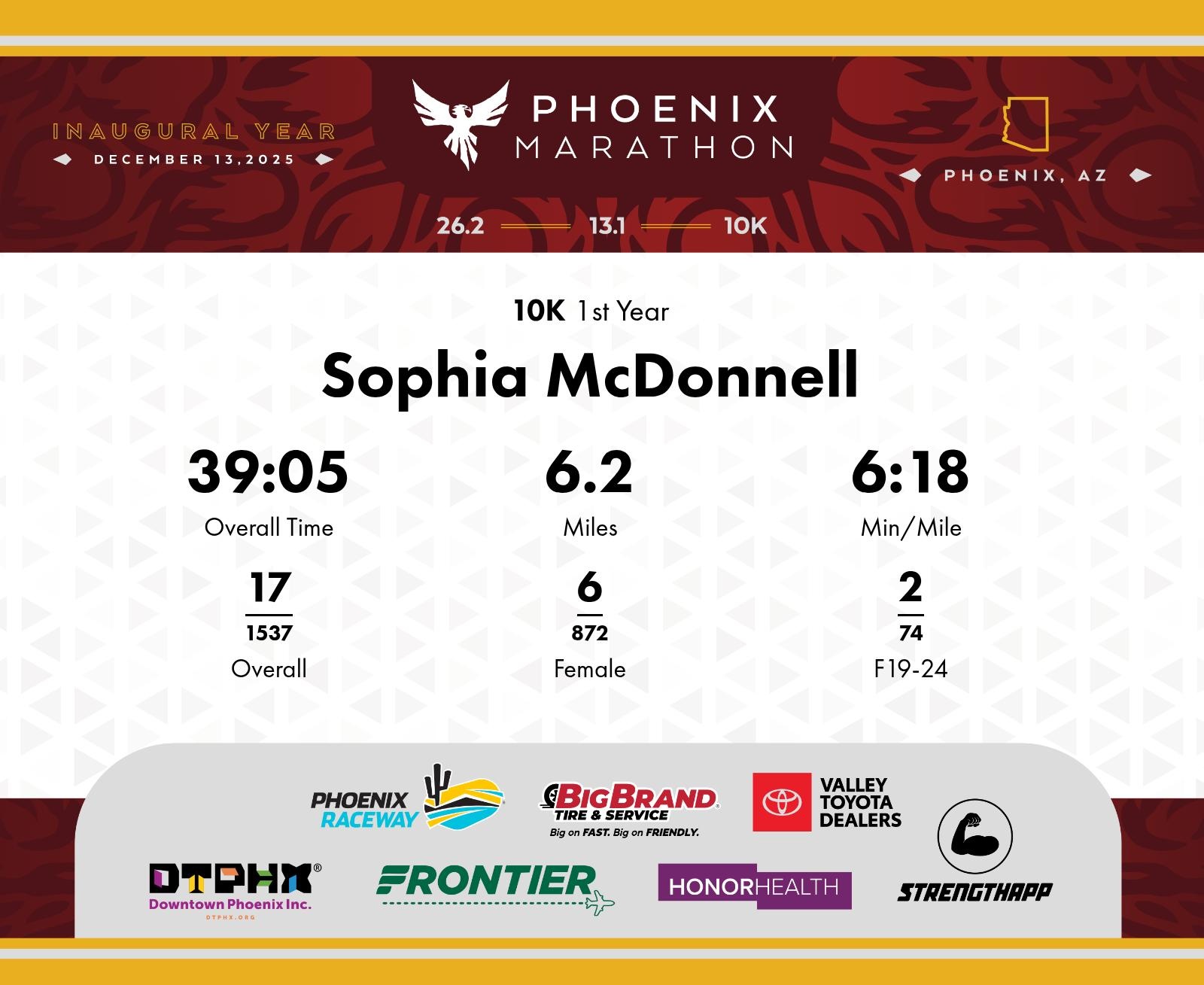Date: Dec. 13, 2025 Participant: Sophia McDonnell #8275 Race: 2025 Phoenix 10K Distance: 6.2 miles