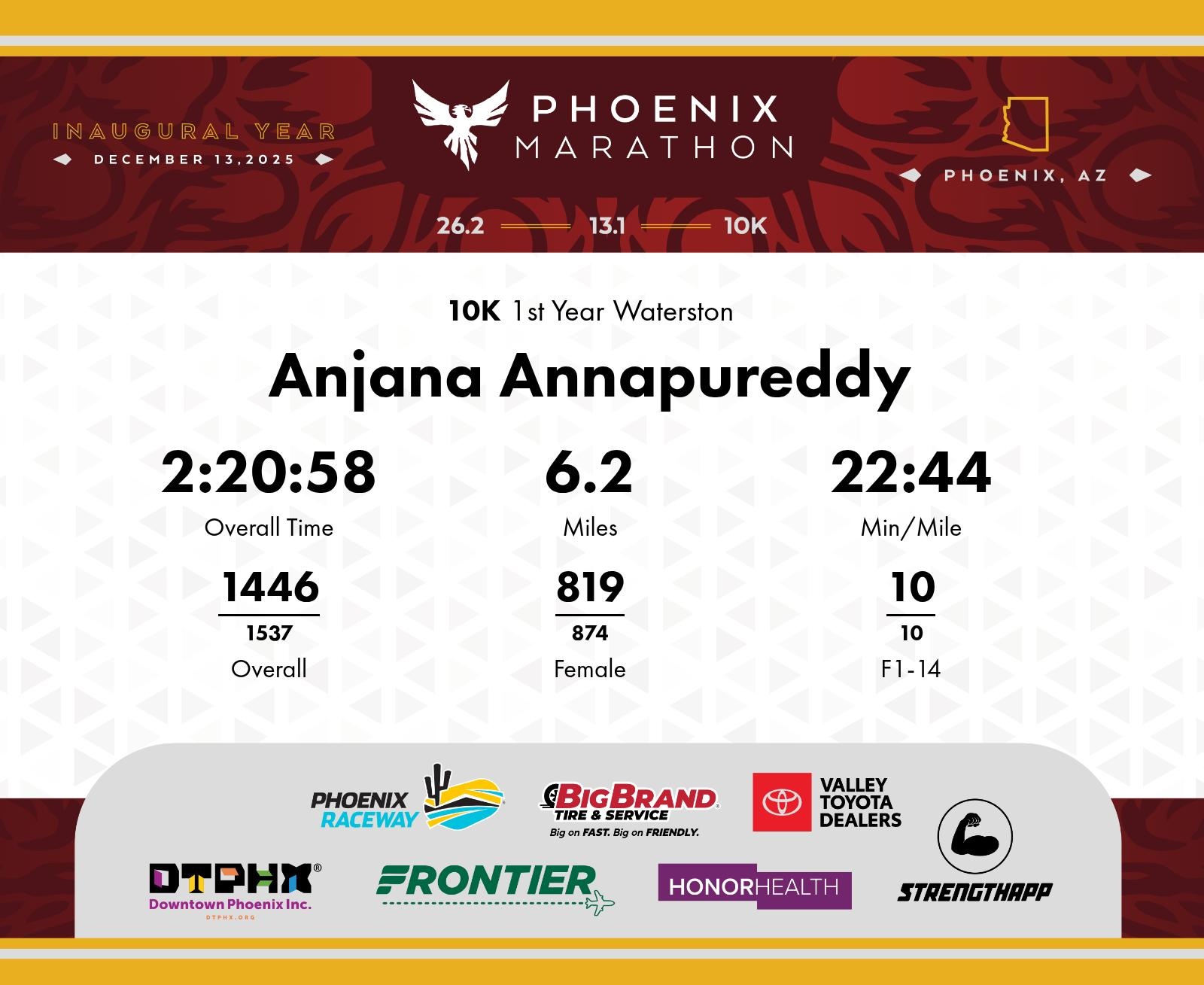 Date: Dec. 13, 2025 Participant: Anjana Annapureddy #6026 Race: 2025 Phoenix 10K Distance: 6.2 miles
