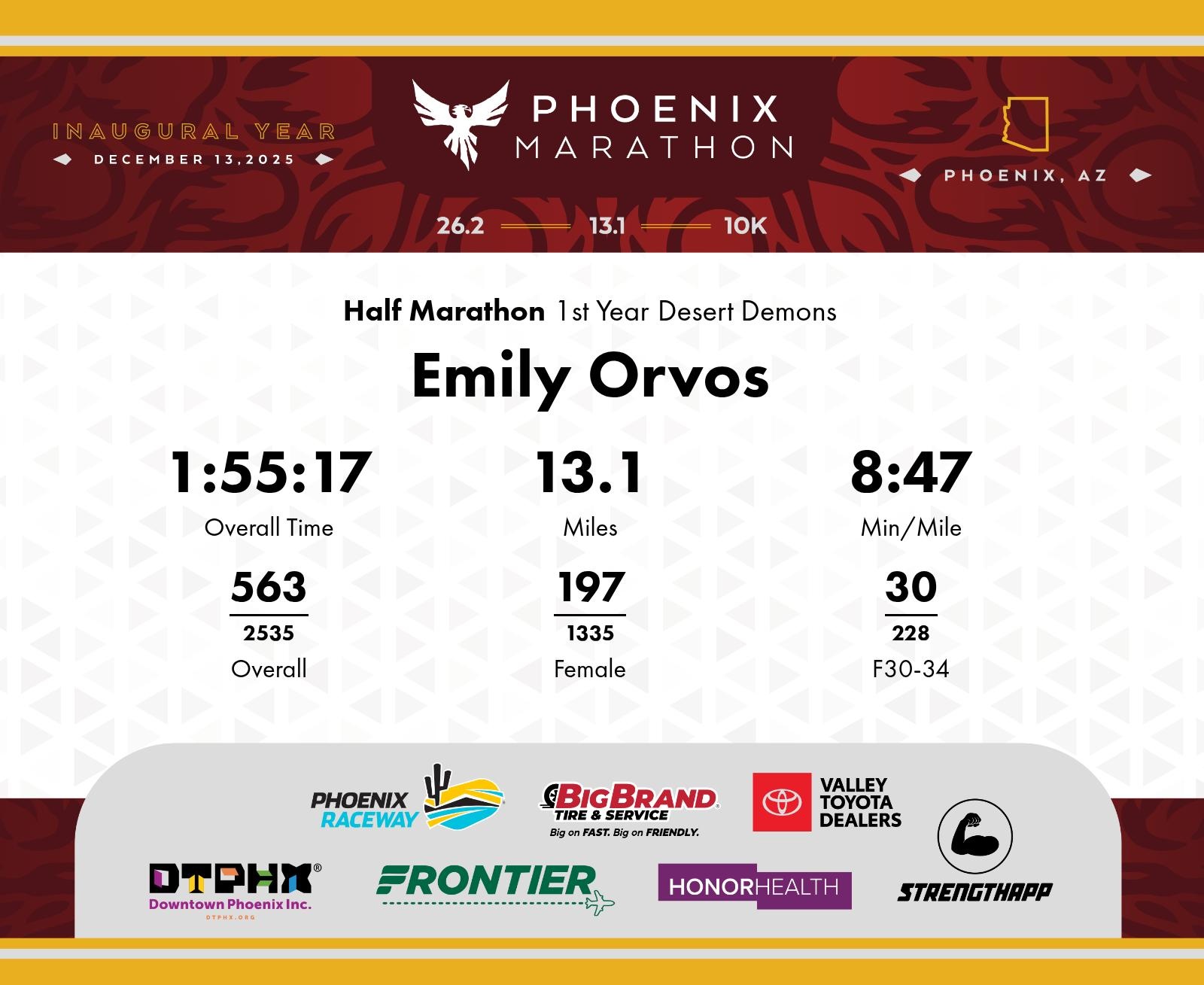Date: Dec. 13, 2025 Participant: Emily Orvos #5114 Race: 2025 Phoenix Half Marathon Distance: 13.1 miles