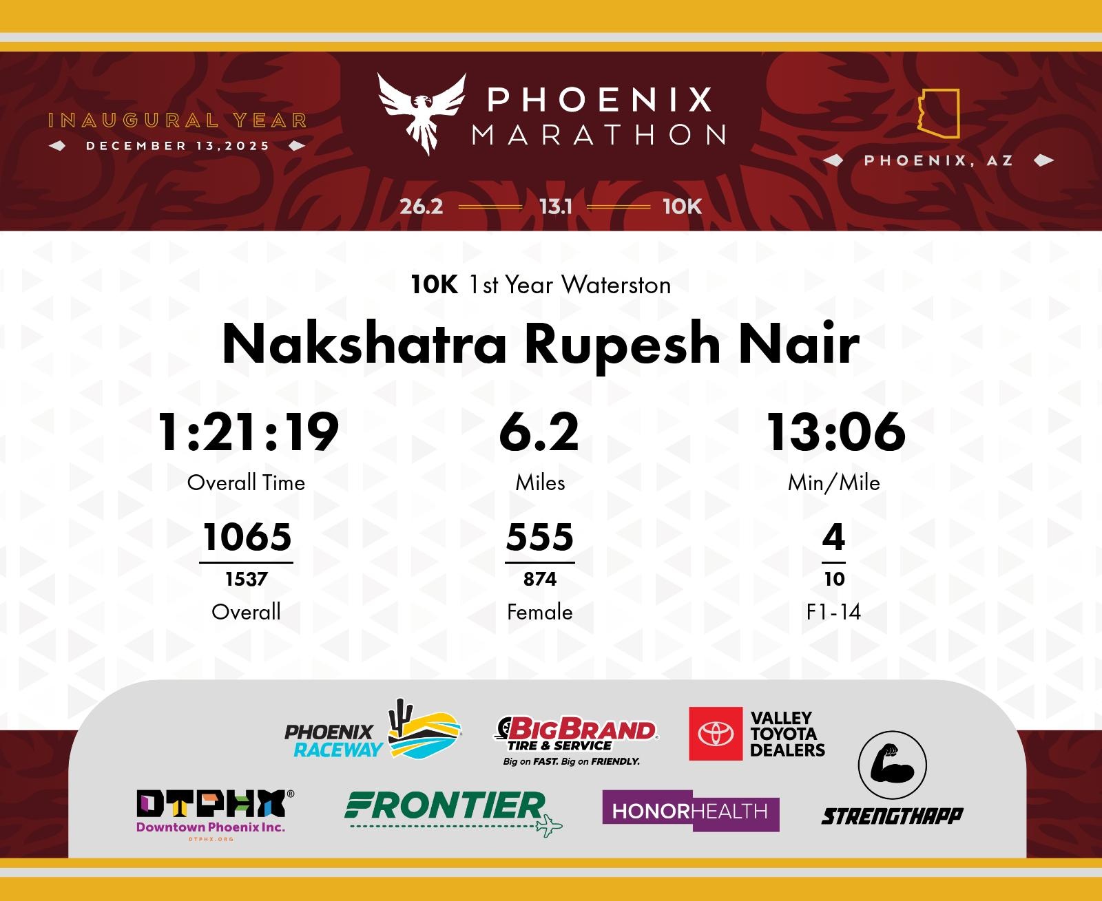 Date: Dec. 13, 2025 Participant: Nakshatra Rupesh Nair #6648 Race: 2025 Phoenix 10K Distance: 6.2 miles