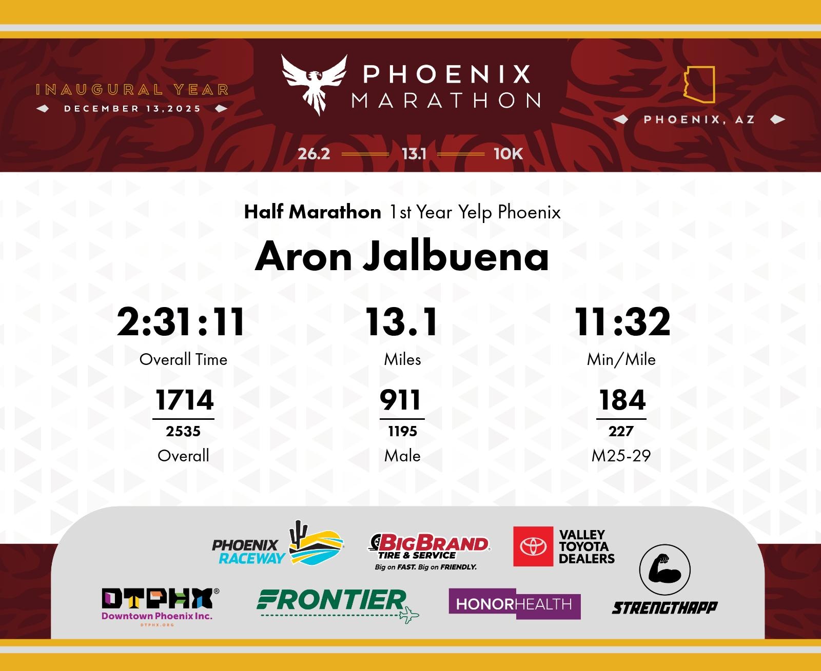 Date: Dec. 13, 2025 Participant: Aron Jalbuena #7334 Race: 2025 Phoenix Half Marathon Distance: 13.1 miles