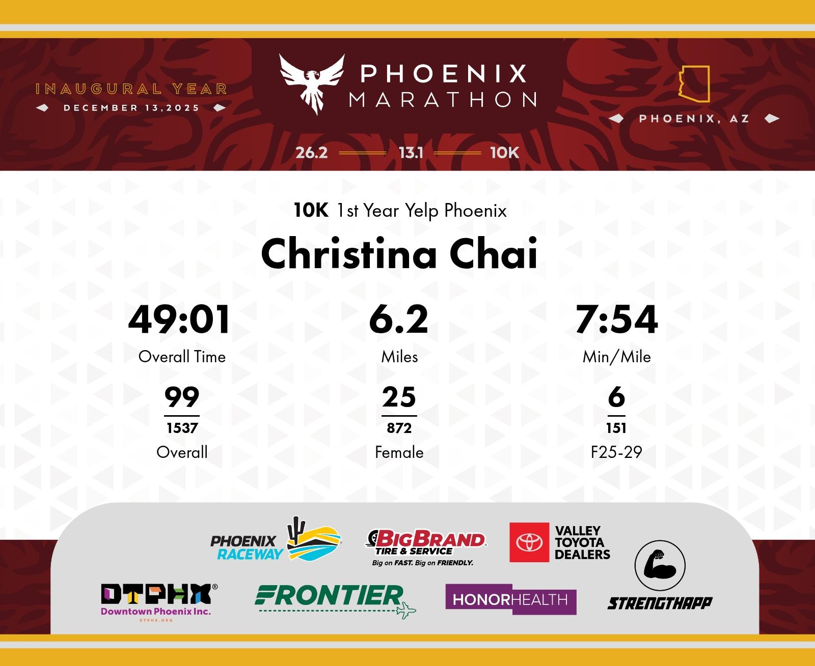 Date: Dec. 13, 2025 Participant: Christina Chai #4277 Race: 2025 Phoenix 10K Distance: 6.2 miles