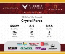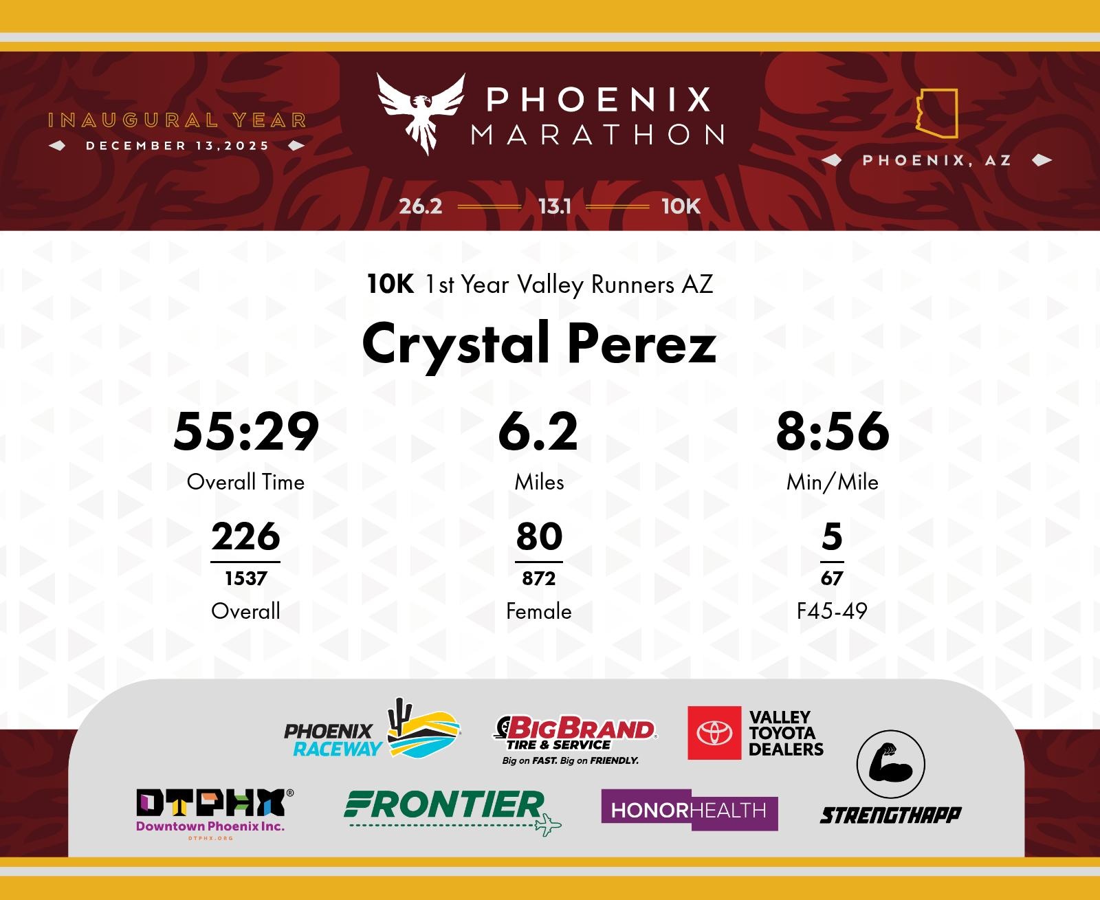 Date: Dec. 13, 2025 Participant: Crystal Perez #8374 Race: 2025 Phoenix 10K Distance: 6.2 miles