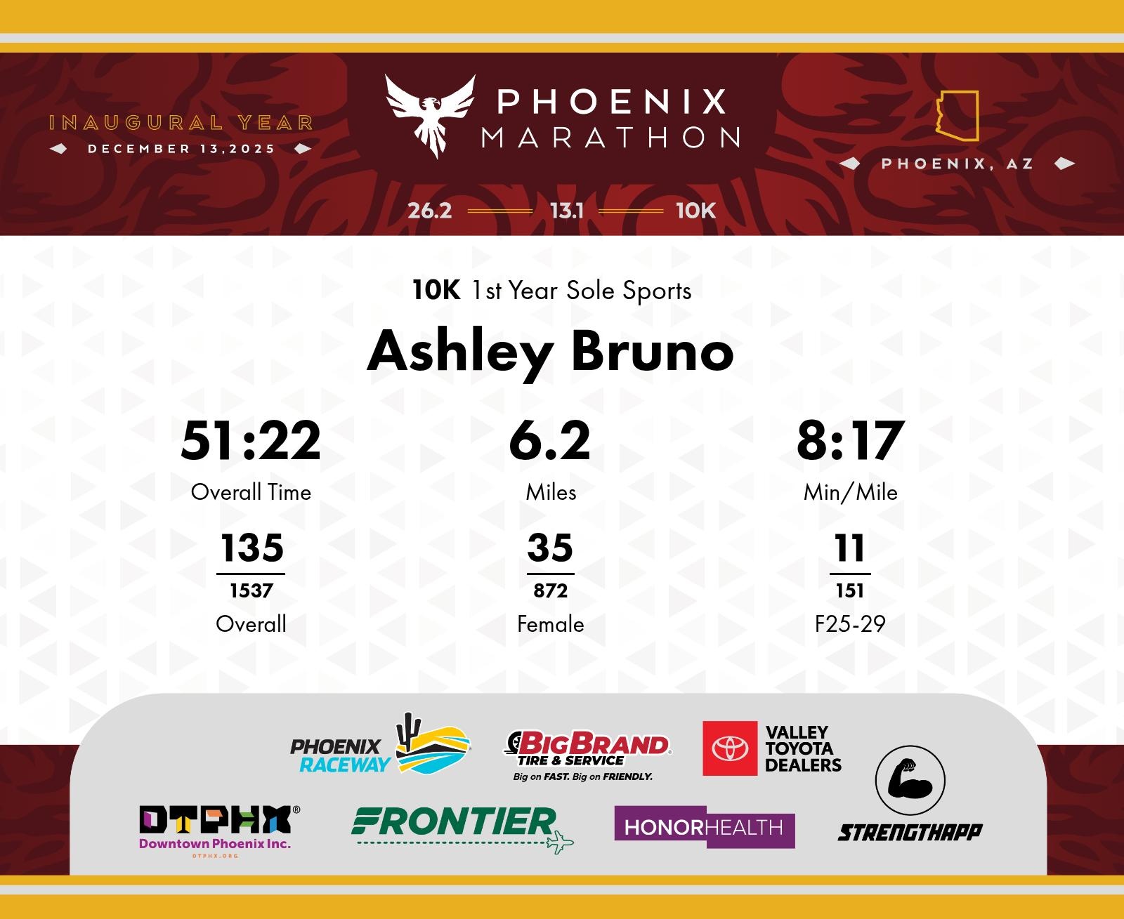 Date: Dec. 13, 2025 Participant: Ashley Bruno #7955 Race: 2025 Phoenix 10K Distance: 6.2 miles